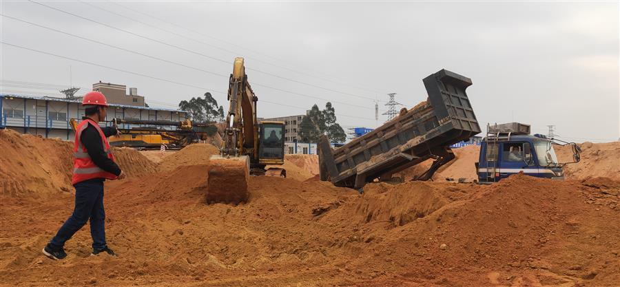 項目部現在已吹響“決戰(zhàn)三十天,沖刺總目標”的號角,各項搶工工作正全面鋪開。目前,安全文明臨時設施已基本施工完畢,現場正緊鑼密鼓地進行主體處障礙山體移除及基坑開挖等工作。