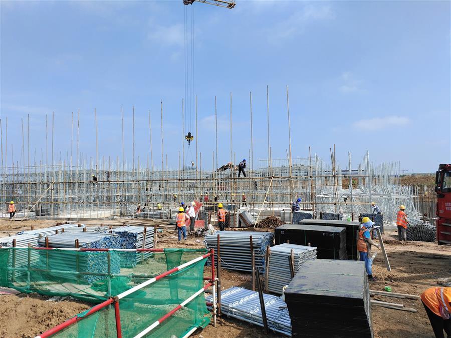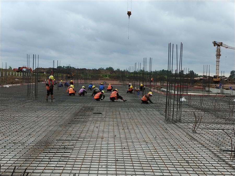 “日均投入施工技術(shù)人員500余人、各類機械設(shè)備45臺搶抓施工節(jié)點?!表椖控?fù)責(zé)人禤旭云說,自6月開工以來,針對項目工期緊、任務(wù)重的情況,項目部按照“開工即攻堅、起步即沖刺”的要求,全面推進(jìn)項目建設(shè)。目前,中試車間基礎(chǔ)回填、褥墊層鋪筑、墊層澆筑、剛性地面鋼筋綁扎完成;1#生產(chǎn)車間53~56軸獨基開挖基礎(chǔ)承臺鋼筋綁扎、模板安裝、砼澆筑完成,48~52軸基礎(chǔ)開挖、墊層澆筑完成;2#生產(chǎn)車間18~25軸基礎(chǔ)承臺鋼筋綁扎、模板安裝、砼澆筑完成;倉庫基礎(chǔ)梁全部完成。
