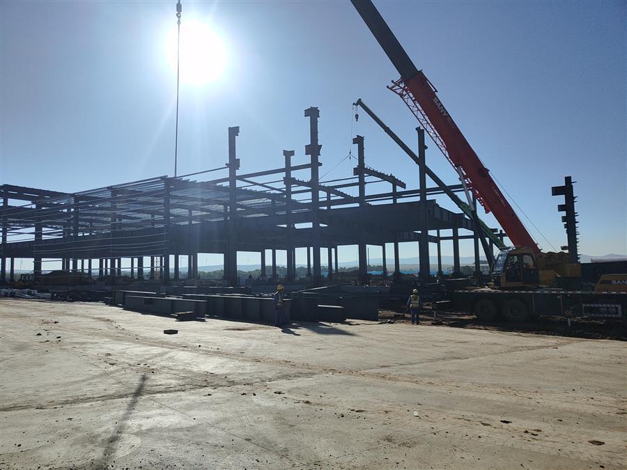 目前,該項(xiàng)目2#配送中心5-12軸鋼結(jié)構(gòu)完成100%,正在進(jìn)行1-4軸二層鋼柱牛腿焊接、6.65米鋼梁安裝及二層鋼柱安裝。2#冷庫(kù)4-12軸交E交J軸防水板混凝土澆筑完成,正在加固13-18軸地下室頂板模板,綁扎4-12軸交A交E軸防水板鋼筋。