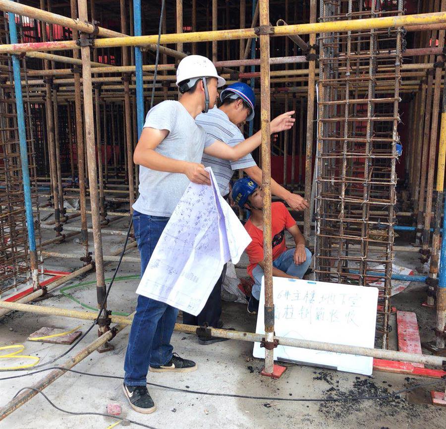 6月18日,在桂華分公司承建的梧州佛子時代廣場項目現(xiàn)場,當空烈日讓偌大的工地一片熾熱,焊花飛濺,工程車來來往往,工人們揮汗如雨。雖然施工作業(yè)已經(jīng)避開了高溫時段,但工人們?nèi)员缓顾粤搜劬?,濕了衣服。盡管這樣,大家仍堅持“全副武裝”,手套、防護用具,安全帽,一樣都沒有少,自覺遵守安全文明施工相關(guān)規(guī)范。入行兩年的施工員趙俊財抹了一把汗說道:“剛參加工作時,不能和家人一起過節(jié)還挺難受的,后來把心態(tài)調(diào)整好了,想著只要家人安好,其實比什么都重要,趁著年輕,還是應(yīng)該多奮斗?!笨粗幻装舜髠€的他手拿圖紙和卷尺,蜷縮著身子,蹲在空間有限且熱得發(fā)燙的平臺上仔細檢查剛剛綁扎好的鋼筋籠,驕陽烤得他黝黑的皮膚泛出一層水光,襯著那還略顯年輕的臉龐,顯得熠熠生輝。