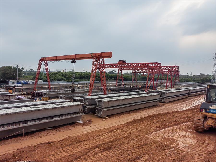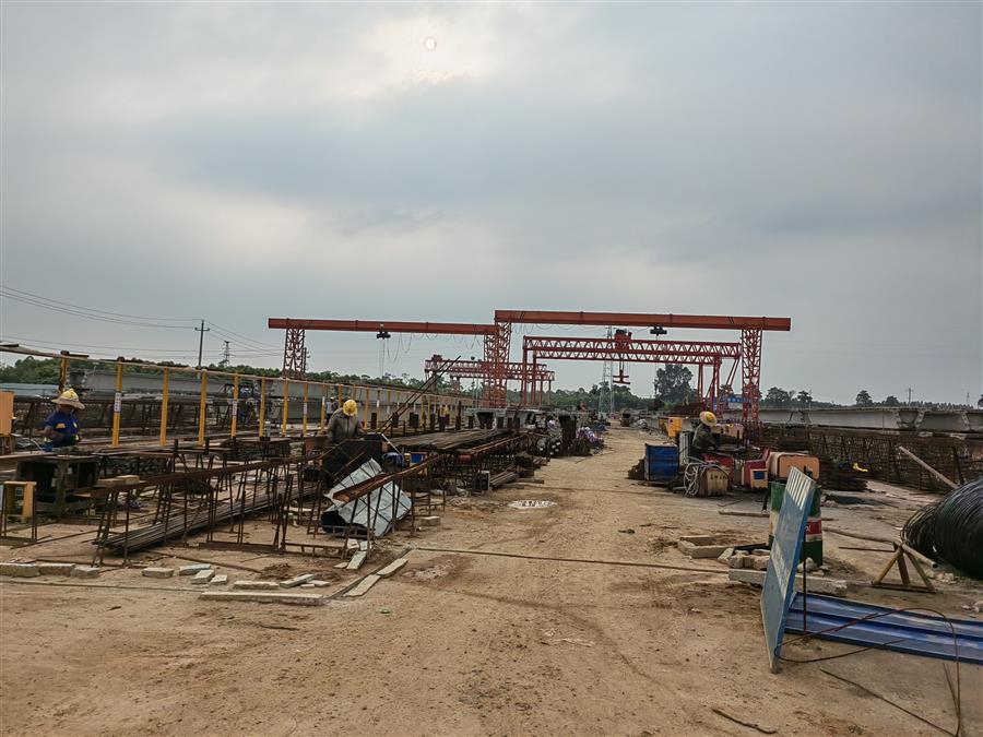 在施工現(xiàn)場,20多臺(tái)大型設(shè)備在不同時(shí)段連續(xù)配合作業(yè),運(yùn)輸車輛有序進(jìn)行運(yùn)土填筑路基、材料進(jìn)出場,100多名項(xiàng)目管理人員及工人分為預(yù)制梁場、樁基施工、橋梁下部結(jié)構(gòu)等班組全線鋪開,在各個(gè)作業(yè)點(diǎn)上有條不紊地開展施工作業(yè)。