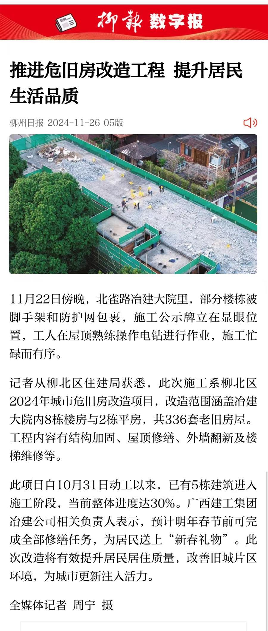 11月25日,《柳州日報》五版以《推進危舊房改造工程 提升居民生活品質(zhì)》為題,圖文并茂的形式報道了冶建大院危舊房改造項目順利推進的情況。