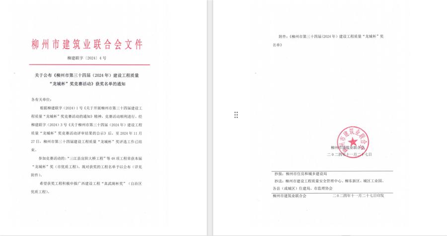 11月28日,柳州市建筑業(yè)聯(lián)合會(huì)公布柳州市第三十四屆(2024年)建設(shè)工程質(zhì)量“龍城杯獎(jiǎng)”競賽活動(dòng)獲獎(jiǎng)名單和2024年柳州市建設(shè)工程優(yōu)質(zhì)結(jié)構(gòu)獎(jiǎng)名單,由冶建公司承建的三江縣宜陽大橋工程等4項(xiàng)工程榮獲“龍城杯”獎(jiǎng);柳州市柳東新區(qū)明德小學(xué)項(xiàng)目(一期)等2項(xiàng)工程獲柳州市“優(yōu)質(zhì)結(jié)構(gòu)獎(jiǎng)”。