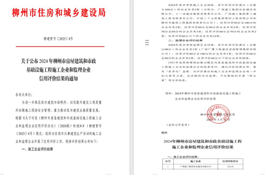 近日,柳州市住房和城鄉(xiāng)建設(shè)局發(fā)布《關(guān)于公布2024年柳州市房屋建筑和市政基礎(chǔ)設(shè)施工程施工企業(yè)和監(jiān)理企業(yè)信用評價結(jié)果的通知》(柳建管字〔2025〕8號),冶建公司以122.18分的優(yōu)異成績,位列柳州市施工企業(yè)信用評價榜首,彰顯了公司在工程質(zhì)量、安全管理及市場信譽等方面的卓越實力。